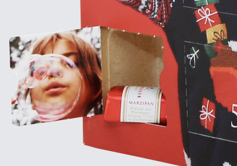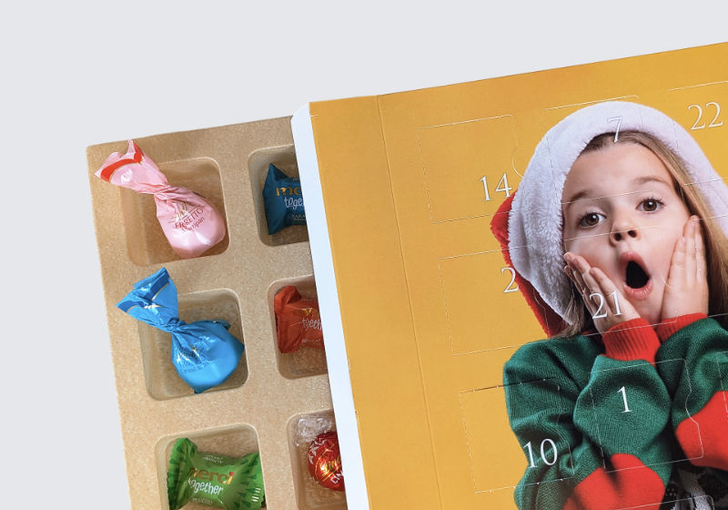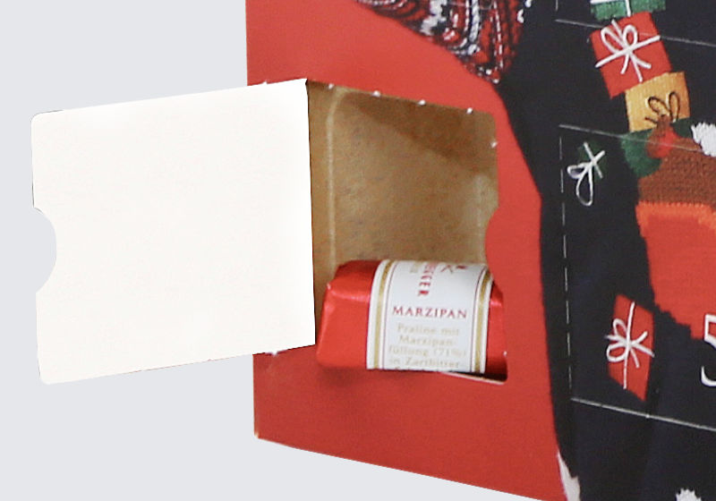 NEU: Die Kalender werden in einem großformatigen Karton von ca. 30 x 42 cm produziert und sind auch am Rand bedruckt. Das Inlay ist aus Papyrus und nicht aus Kunststoff und bietet Platz für leckere Füllungen. Sie können aus 9 verschiedenen Schokoladenfüllungen oder der Variante zum Selbstbefüllen wählen.