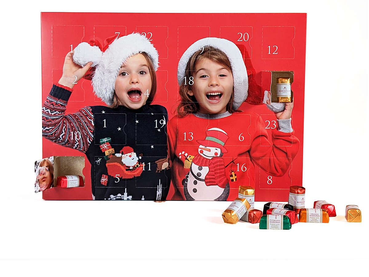 Gestalten Sie den Titel und alle Türchen mit eigenen Fotos. Für Marzipan-Liebhaber. Ihr Adventskalender mit Schoko-Pralinen und hochwertigem Niederegger-Marzipan gefüllt. In den neun Sorten: Espresso, Marzipan in Vollmilch-Schokolade, Gin Tonic, Marzipan in Zartbitter-Schokolade, Orange, Ananas, Rum-Krokant, Apfel-Calvados, Pistazie, Mirabellengeist. Enthält Alkohol. Füllgewicht: 300 g.